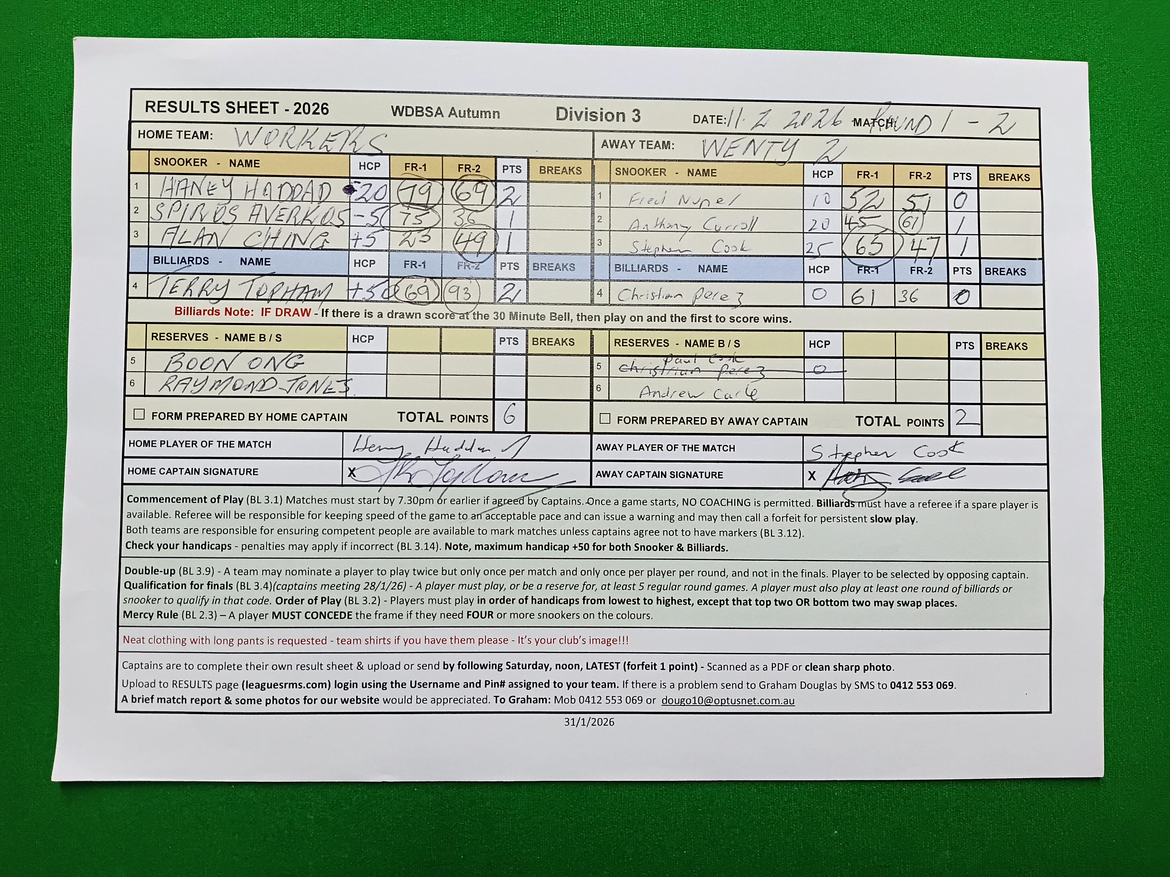 | POS | Workers | Frame 1 | Net | Frame 2 | Net | PTS | Breaks | Wenty #2 | Frame 1 | Net | Frame 2 | Net | PTS | Breaks | Result Note | Updated on | Update by |