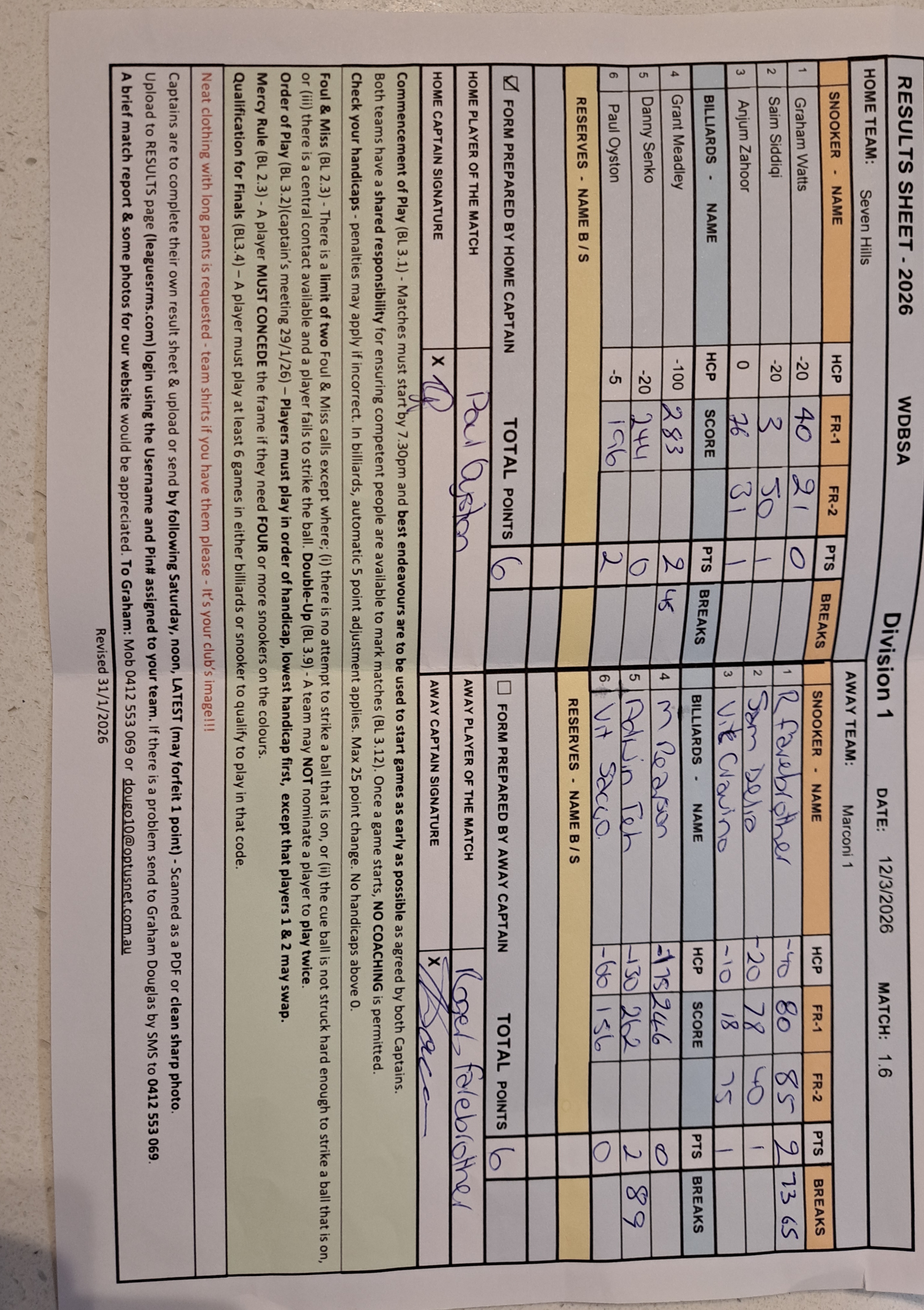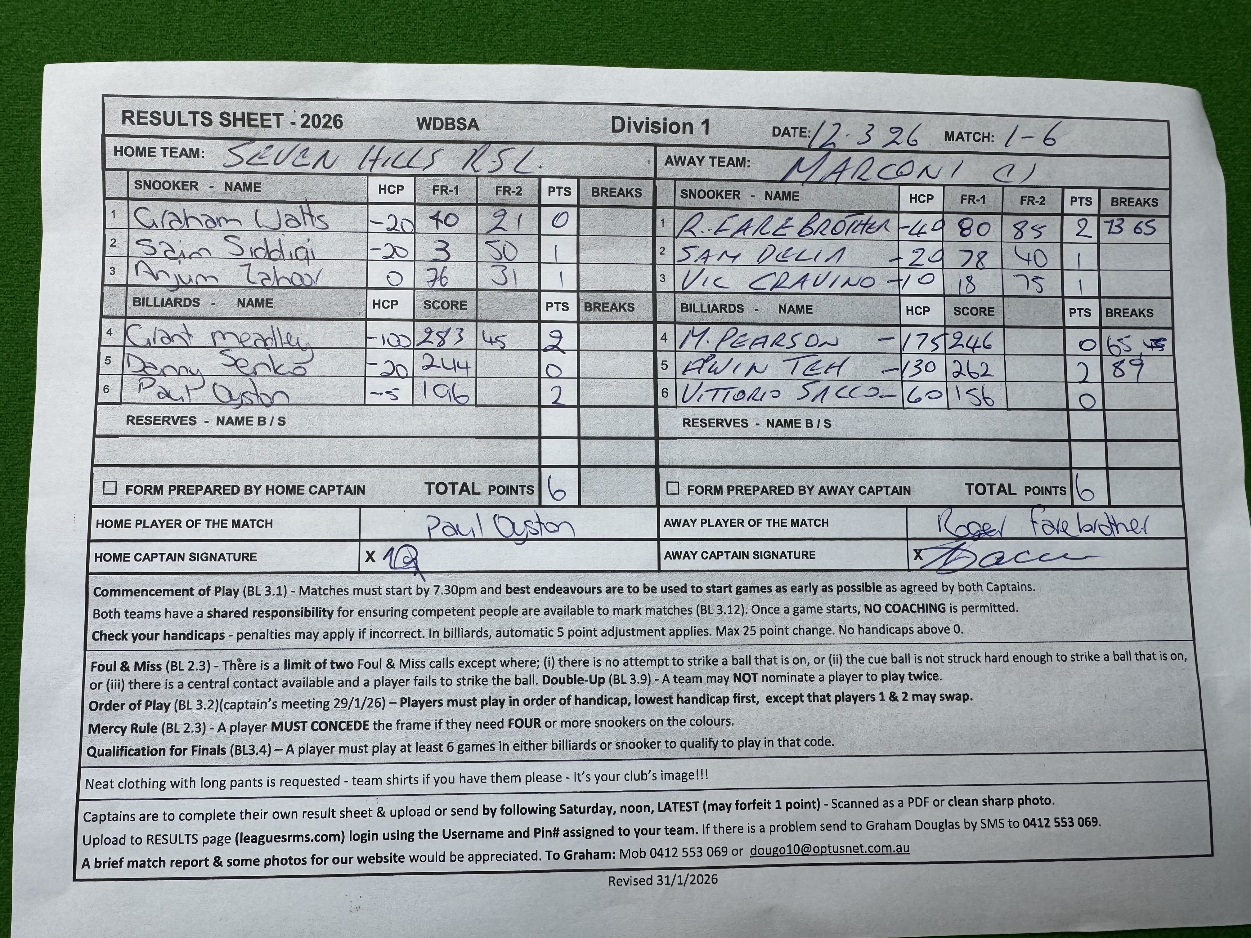 | POS | Seven Hills | Frame 1 | Net | Frame 2 | Net | PTS | Breaks | Marconi #1 | Frame 1 | Net | Frame 2 | Net | PTS | Breaks | Result Note | Updated on | Update by |