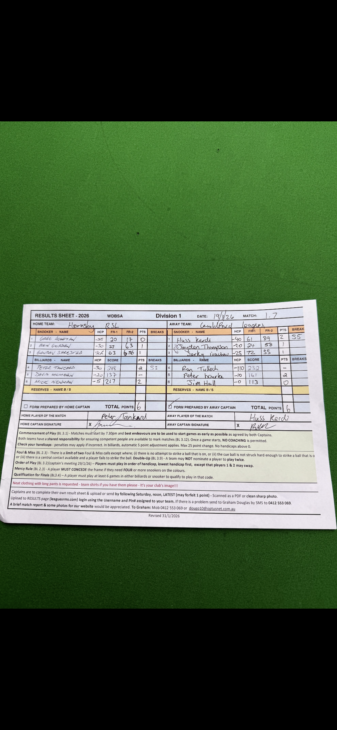 | POS | Hornsby | Frame 1 | Net | Frame 2 | Net | PTS | Breaks | Guildford | Frame 1 | Net | Frame 2 | Net | PTS | Breaks | Result Note | Updated on | Update by |