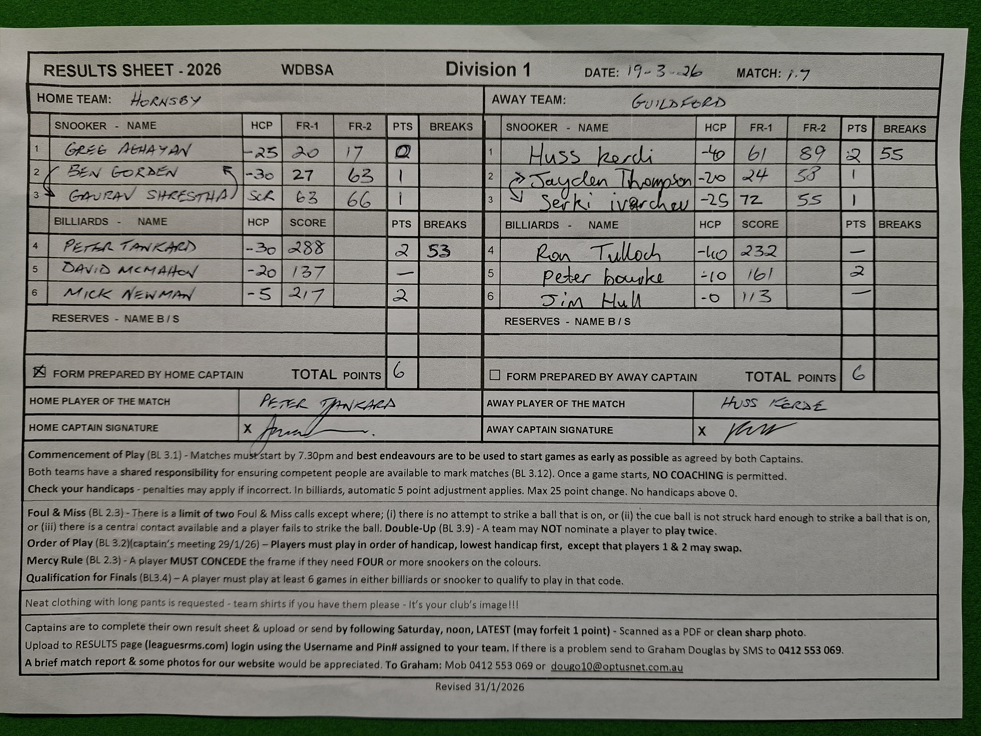 | POS | Hornsby | Score | Net | PTS | Break | Guildford | Score | Net | PTS | Breaks | Result Note | Updated on | Update by |