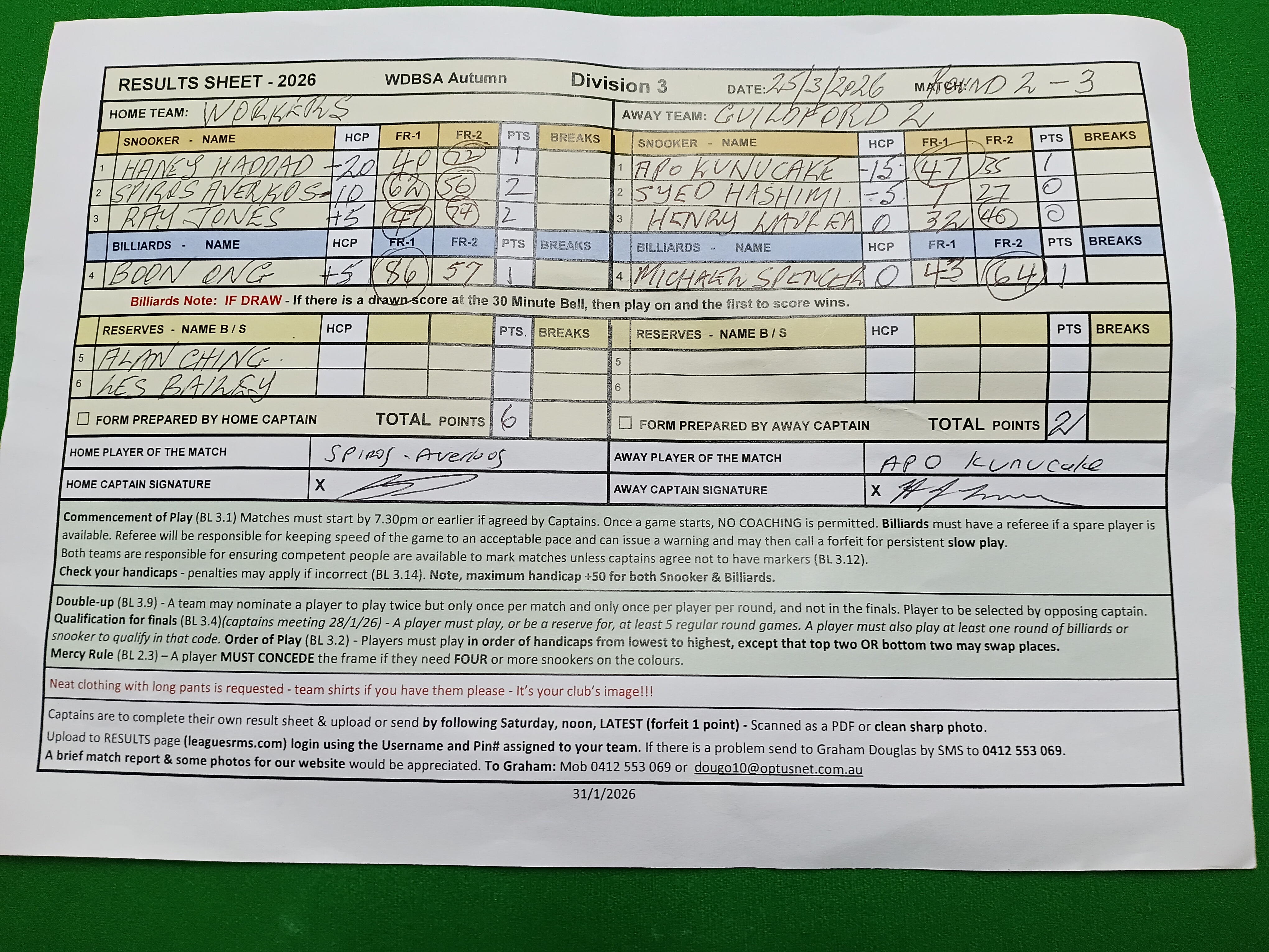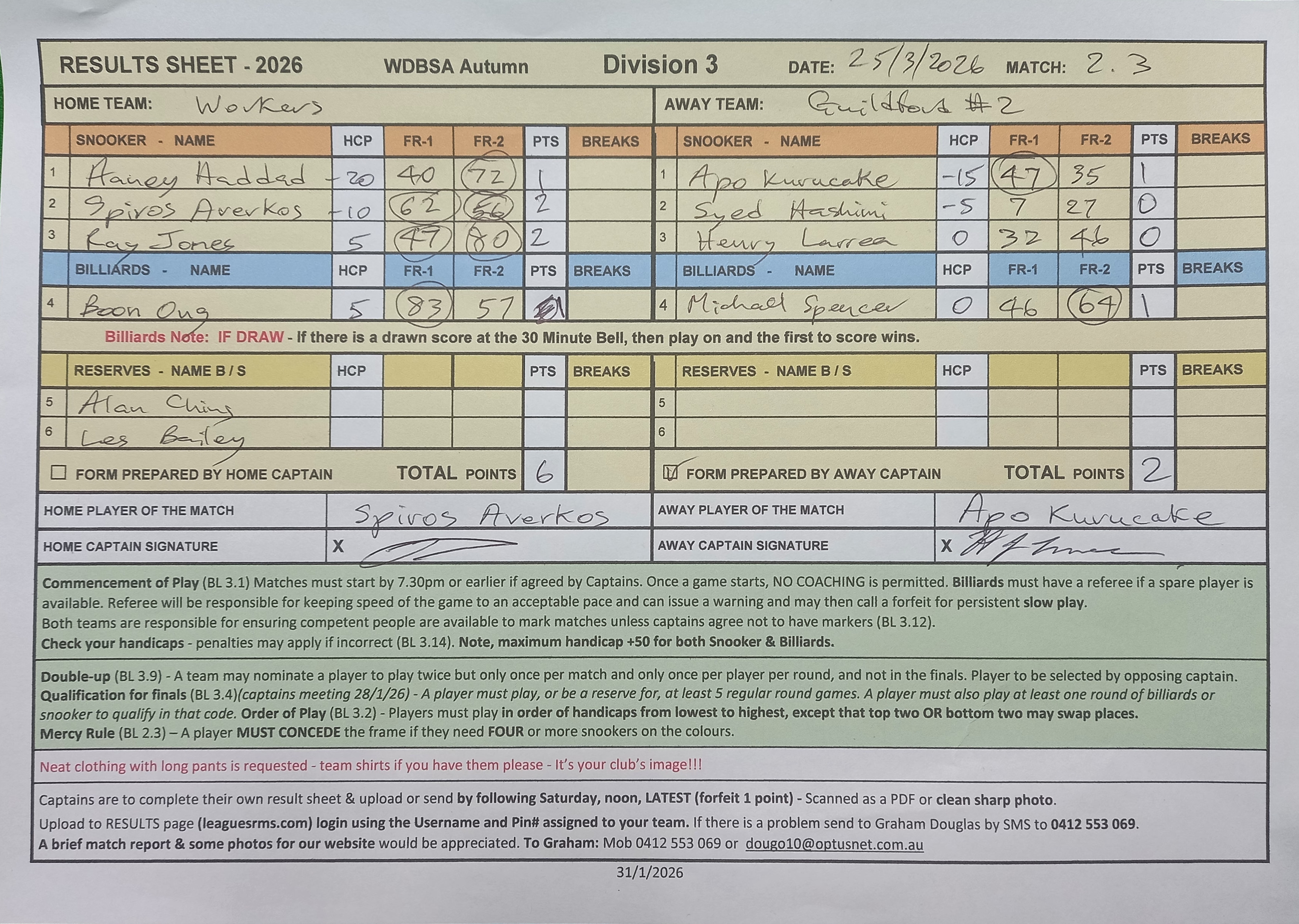 | POS | Workers | Frame 1 | Net | Frame 2 | Net | PTS | Breaks | Guildford #2 | Frame 1 | Net | Frame 2 | Net | PTS | Breaks | Result Note | Updated on | Update by |