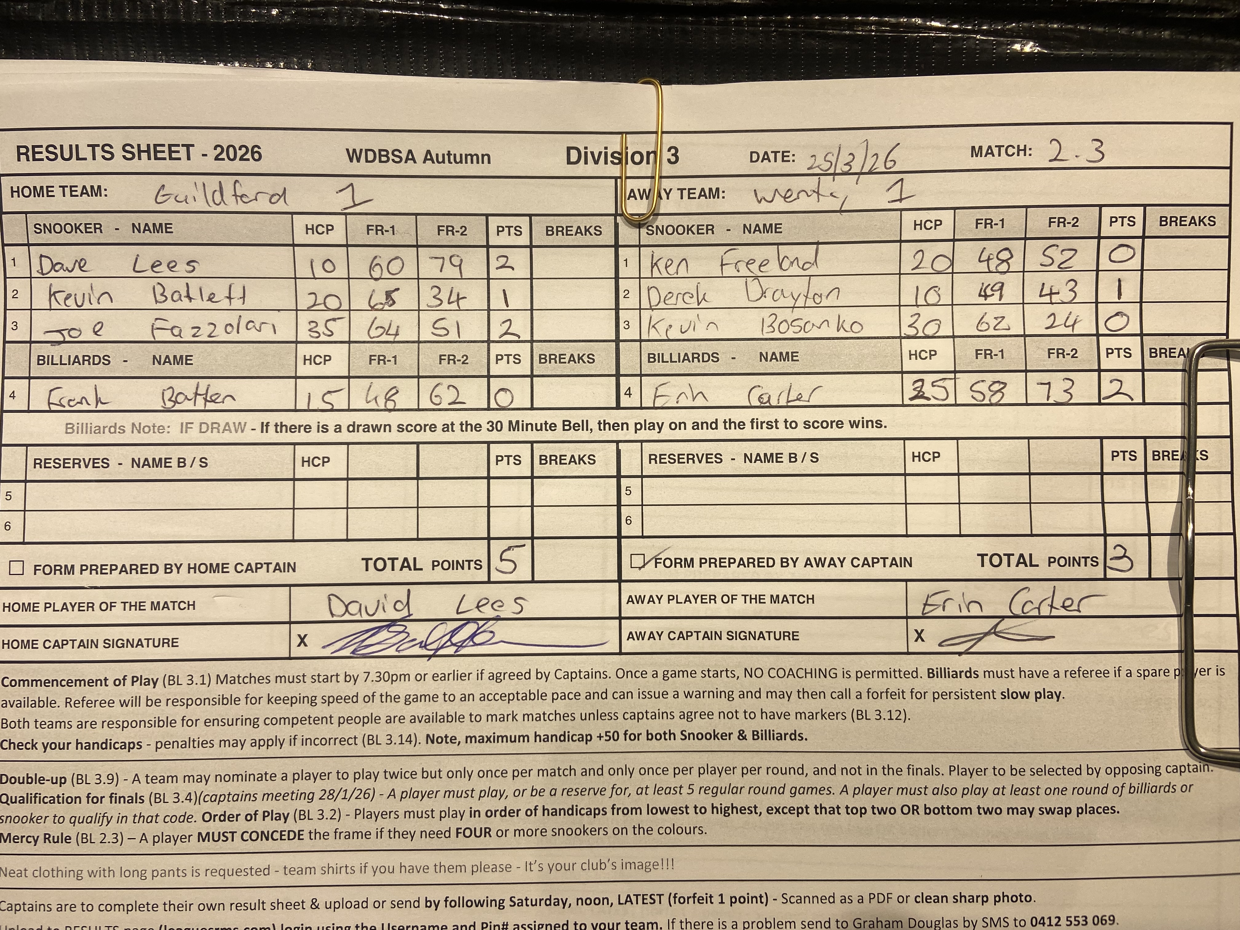 | Frank Batten (15) | Erin Carter (25) | 2026-03-26 04:50:04 | Guildford #1 |