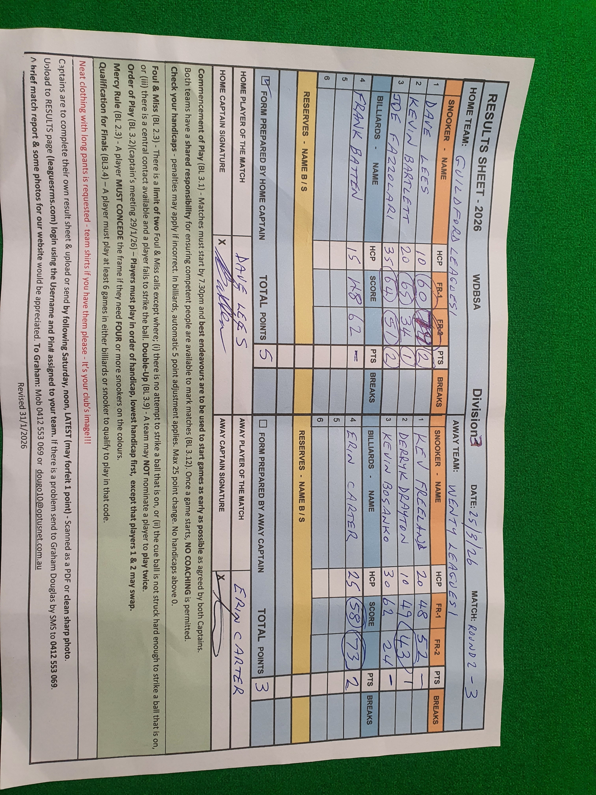 | POS | Guildford #1 | Frame 1 | Net | Frame 2 | Net | PTS | Breaks | Wenty #1 | Frame 1 | Net | Frame 2 | Net | PTS | Breaks | Result Note | Updated on | Update by |