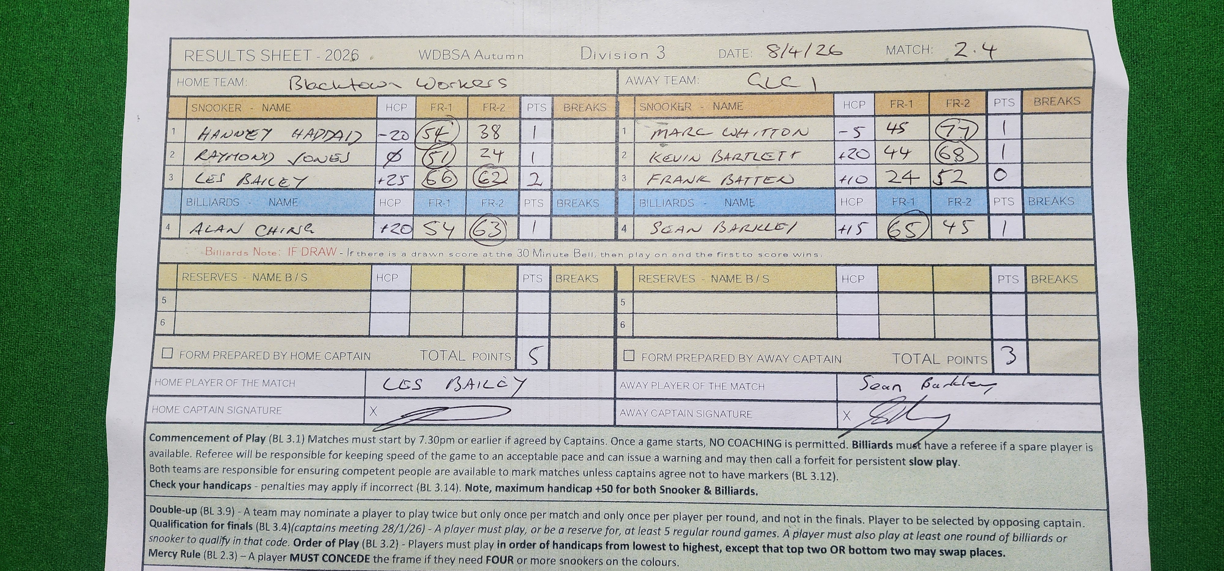 | POS | Workers | Frame 1 | Net | Frame 2 | Net | PTS | Breaks | Guildford #1 | Frame 1 | Net | Frame 2 | Net | PTS | Breaks | Result Note | Updated on | Update by |