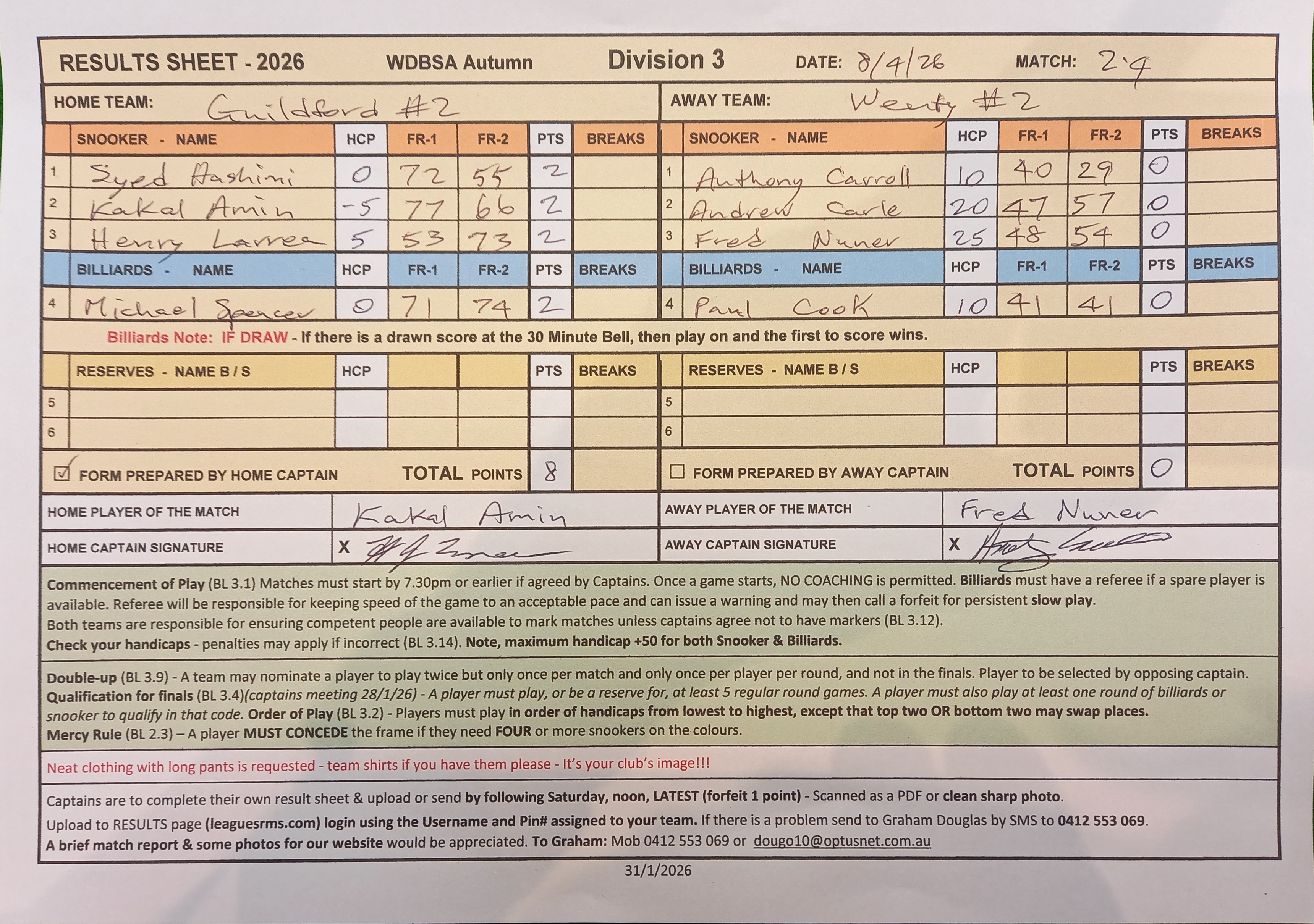 | Syed Hashimi (0) | Anthony Carroll (10) | 2026-04-08 21:48:43 | Guildford #2 | ||||||||||||||