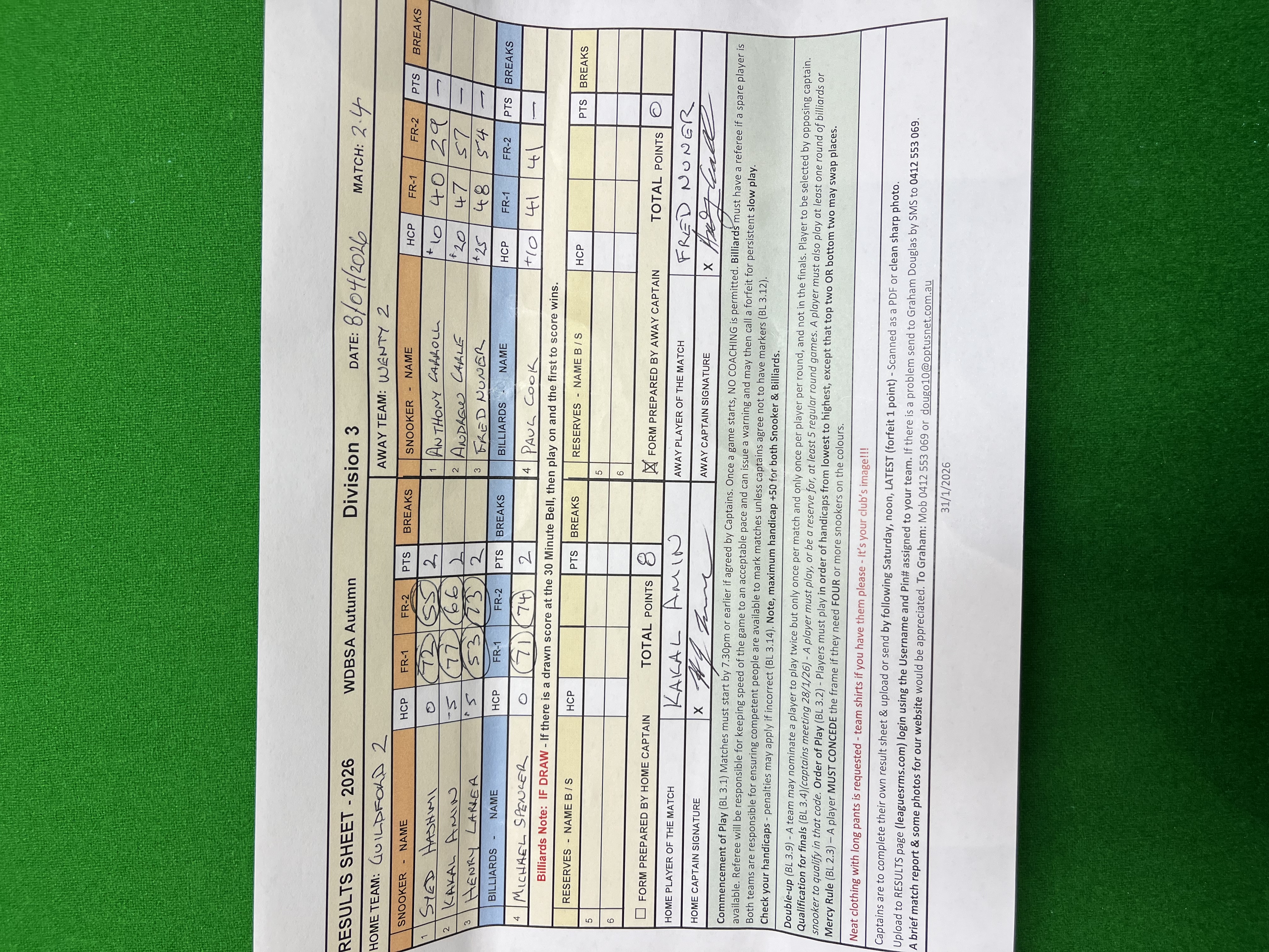 | POS | Guildford #2 | Frame 1 | Net | Frame 2 | Net | PTS | Breaks | Wenty #2 | Frame 1 | Net | Frame 2 | Net | PTS | Breaks | Result Note | Updated on | Update by |