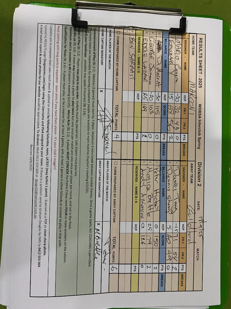 POS | Marconi | Frame 1 | Net | Frame 2 | Net | PTS | Breaks | Guildford | Frame 1 | Net | Frame 2 | Net | PTS | Breaks | Result Note | Updated on | Update by |