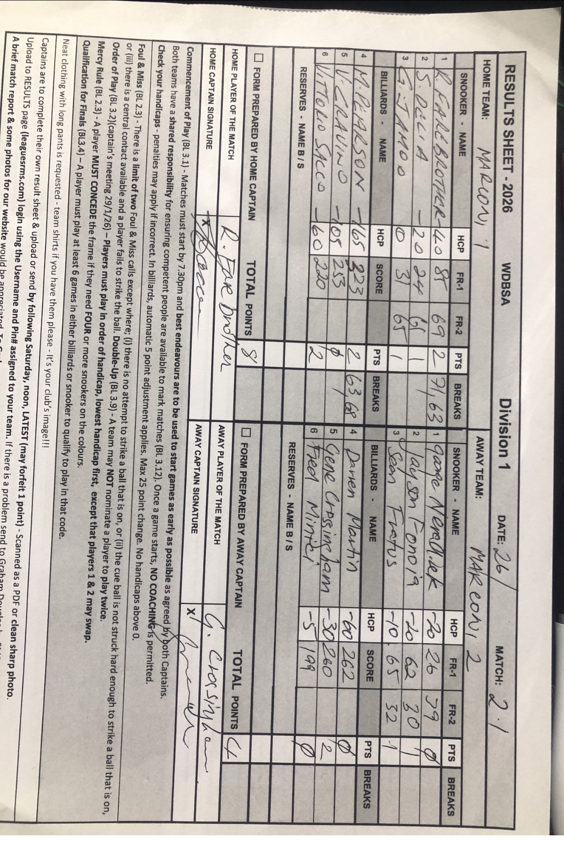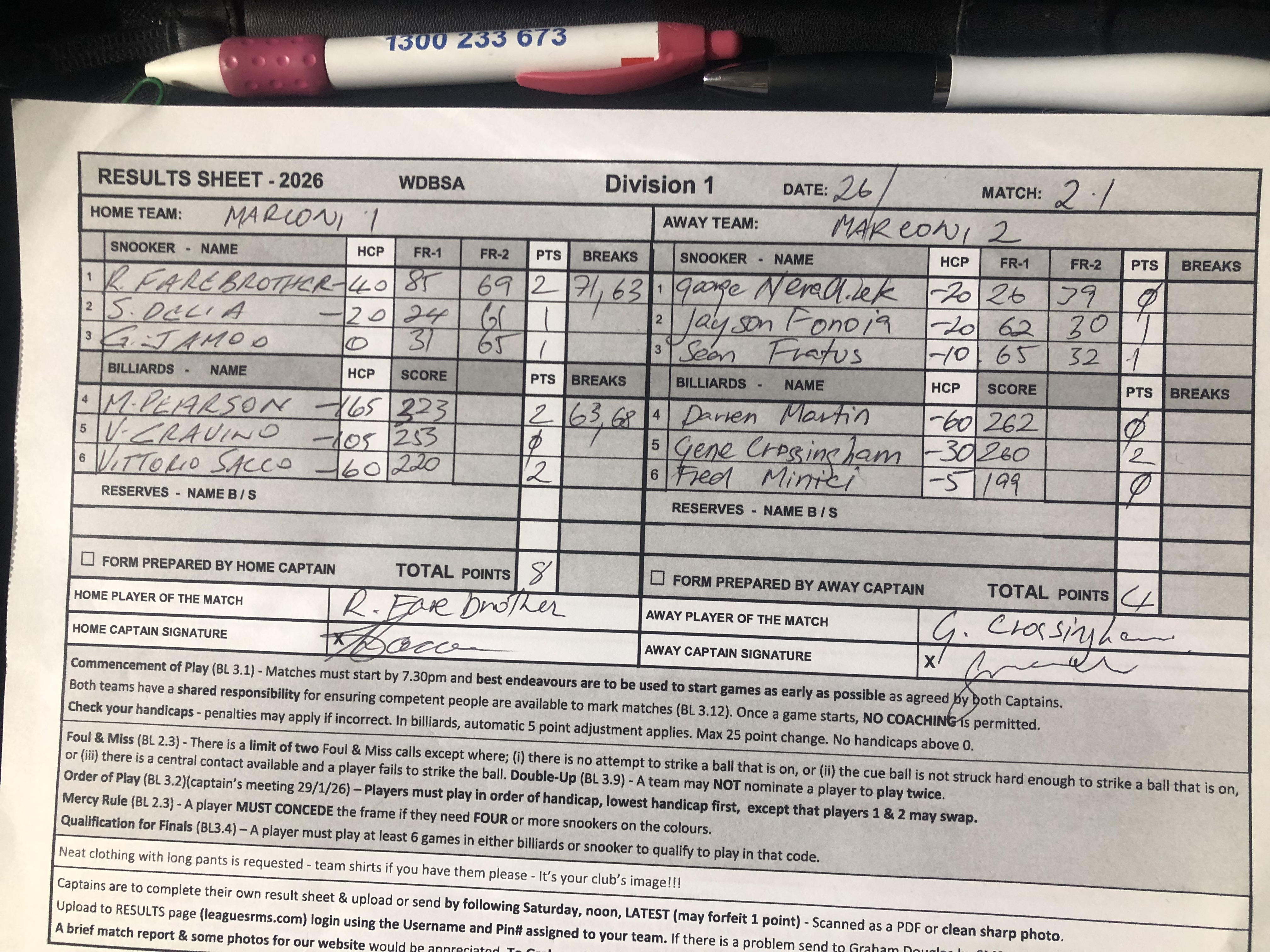 | POS | Marconi #1 | Frame 1 | Net | Frame 2 | Net | PTS | Breaks | Marconi #2 | Frame 1 | Net | Frame 2 | Net | PTS | Breaks | Result Note | Updated on | Update by |
