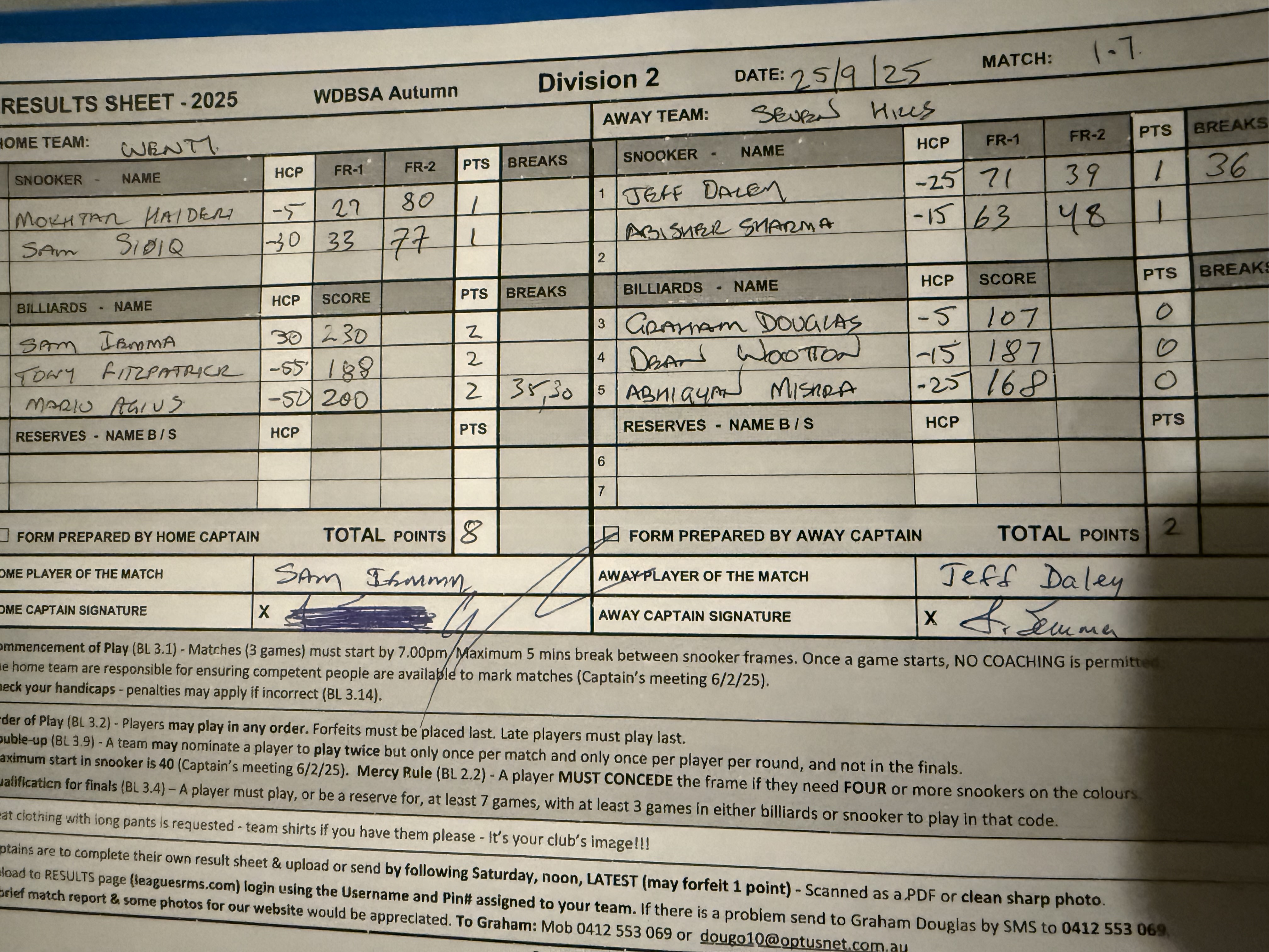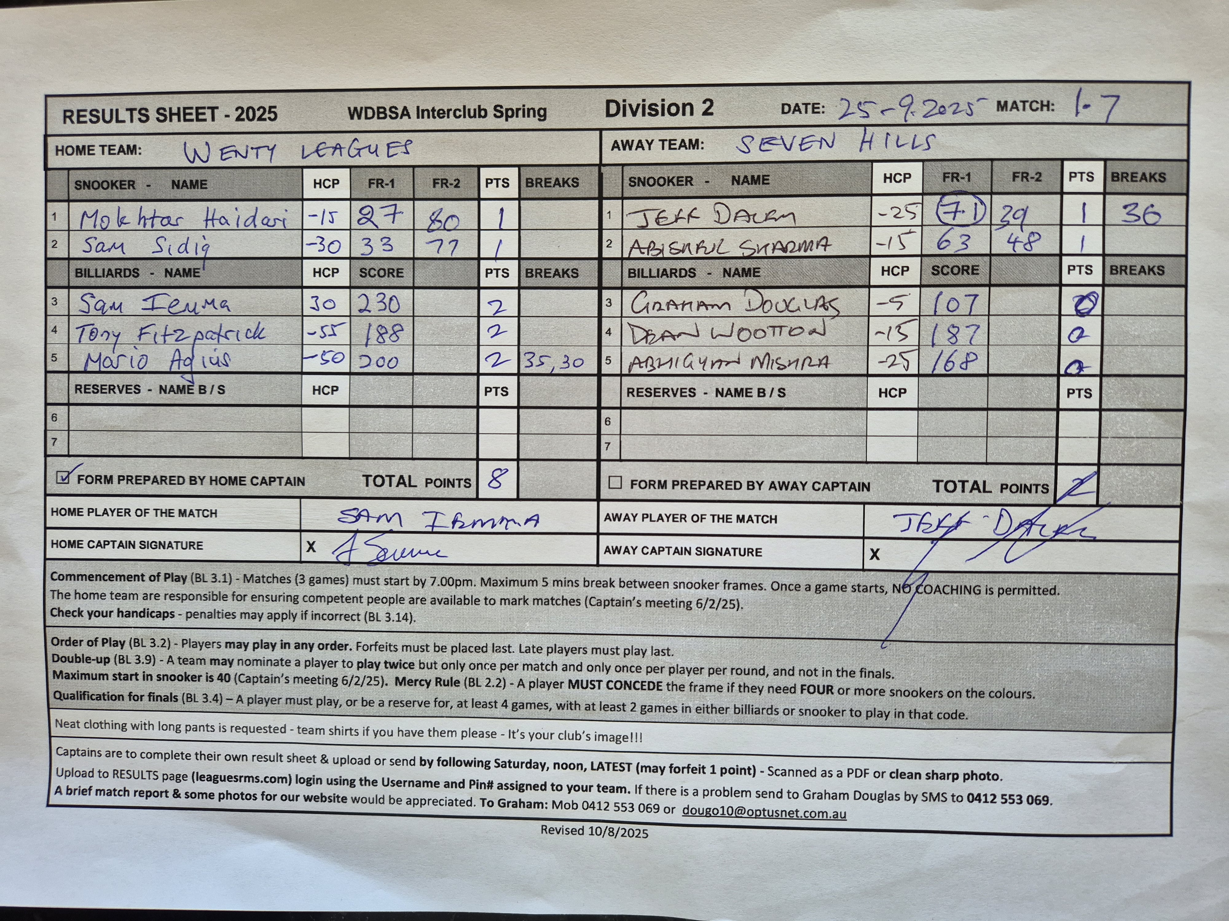 POS | Wenty | Frame 1 | Net | Frame 2 | Net | PTS | Breaks | Seven Hills | Frame 1 | Net | Frame 2 | Net | PTS | Breaks | Result Note | Updated on | Update by |
