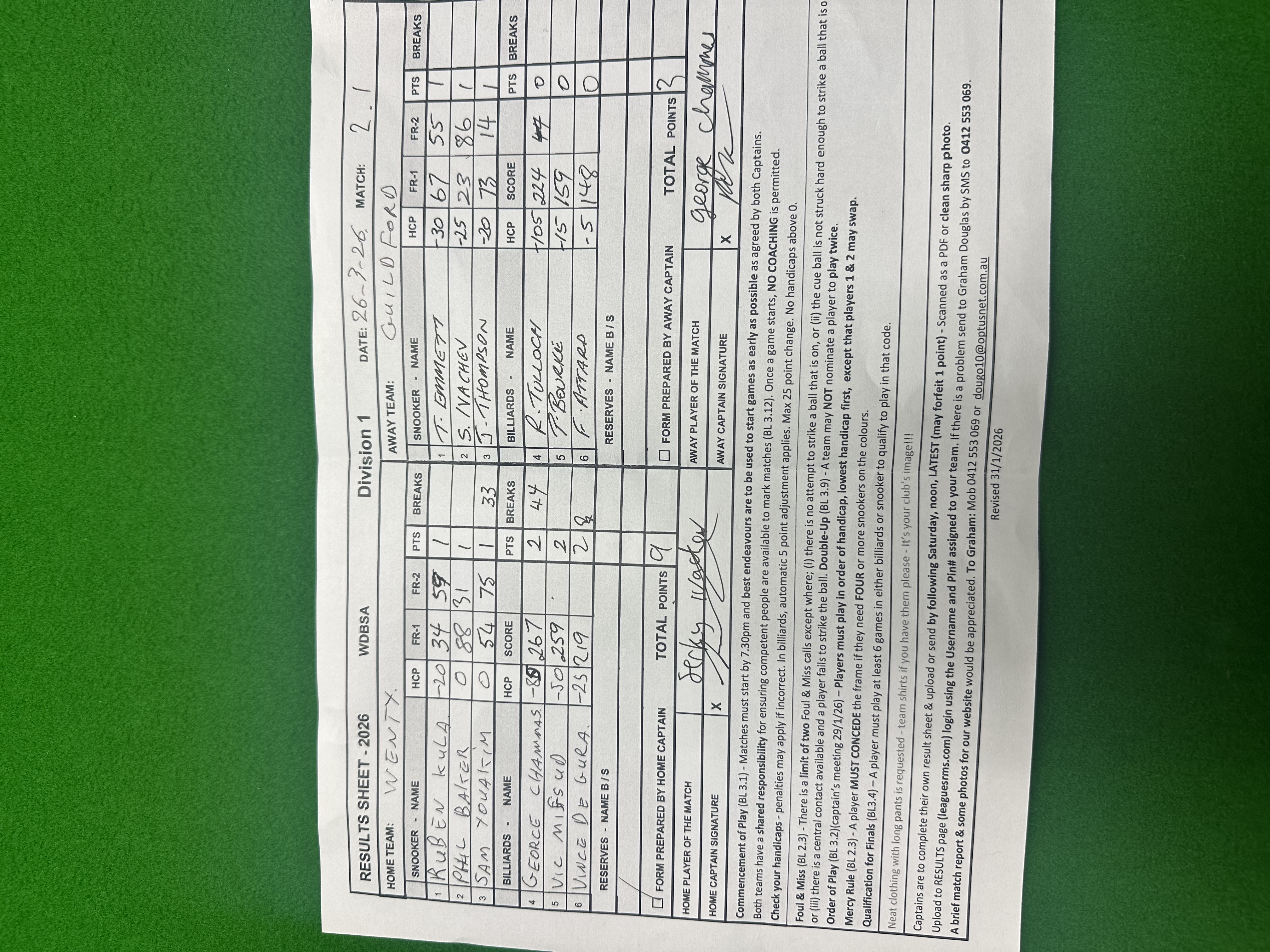 | POS | Wenty | Frame 1 | Net | Frame 2 | Net | PTS | Breaks | Guildford | Frame 1 | Net | Frame 2 | Net | PTS | Breaks | Result Note | Updated on | Update by |