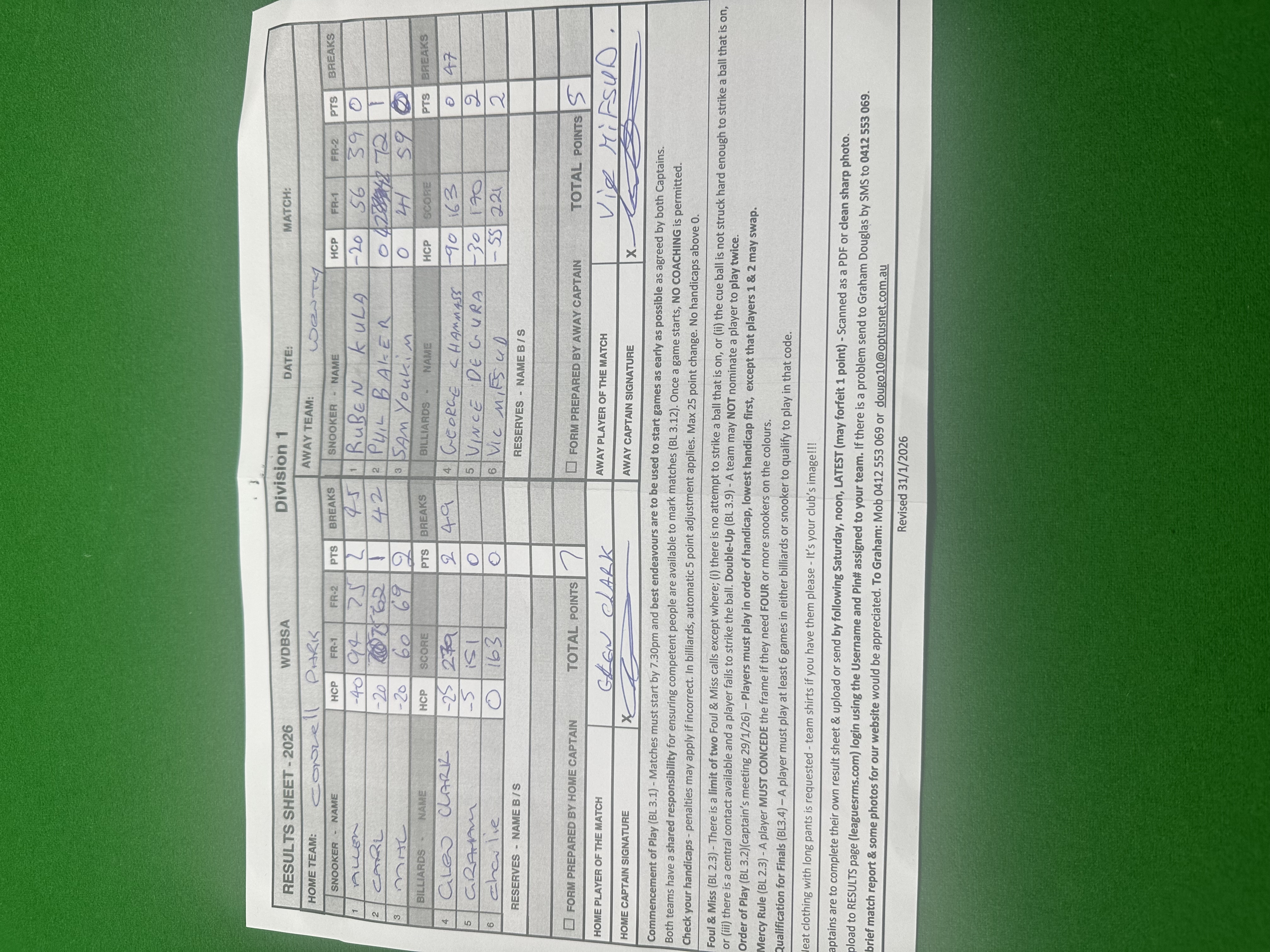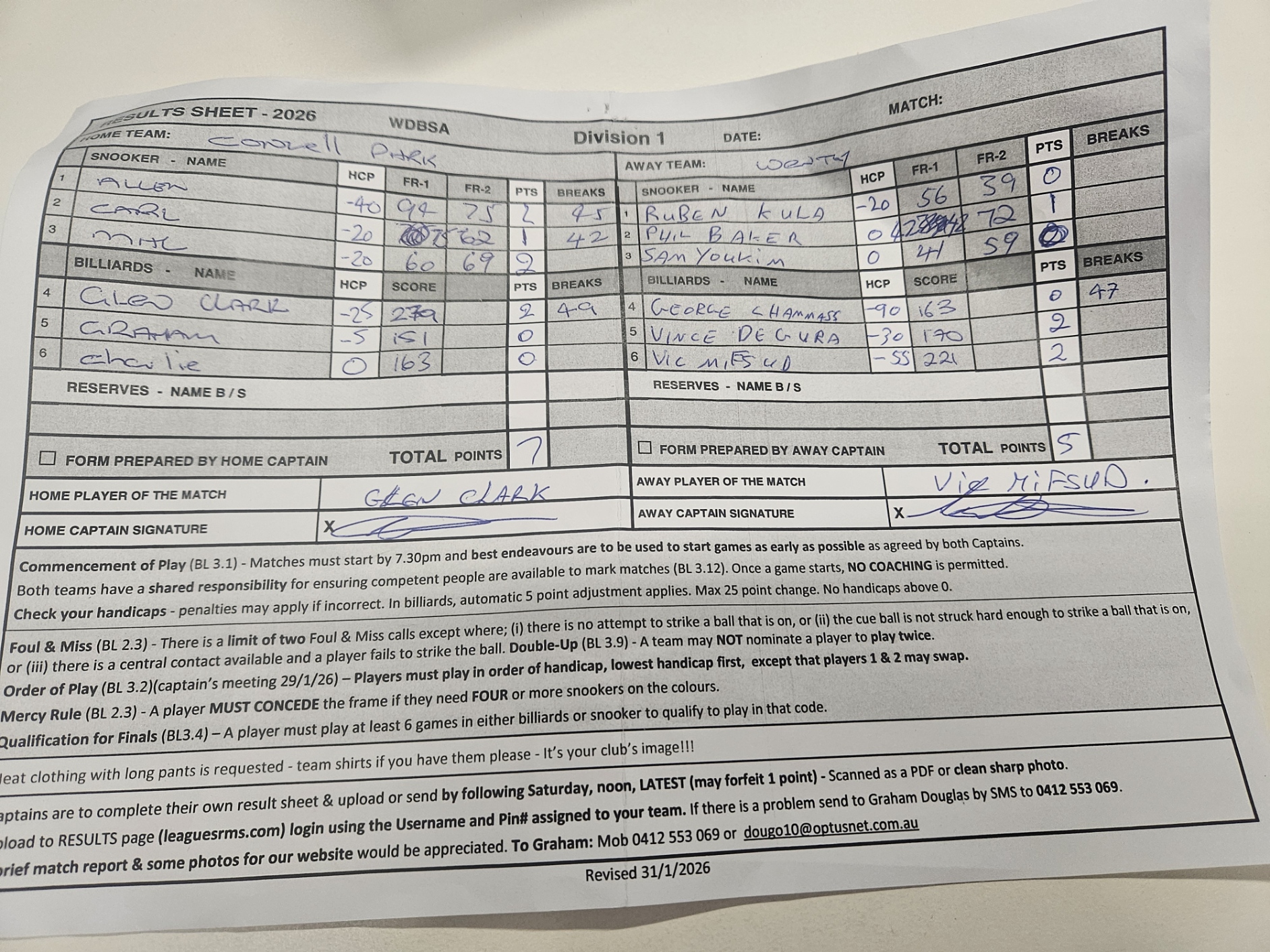 | POS | Condell Park | Frame 1 | Net | Frame 2 | Net | PTS | Breaks | Wenty | Frame 1 | Net | Frame 2 | Net | PTS | Breaks | Result Note | Updated on | Update by |