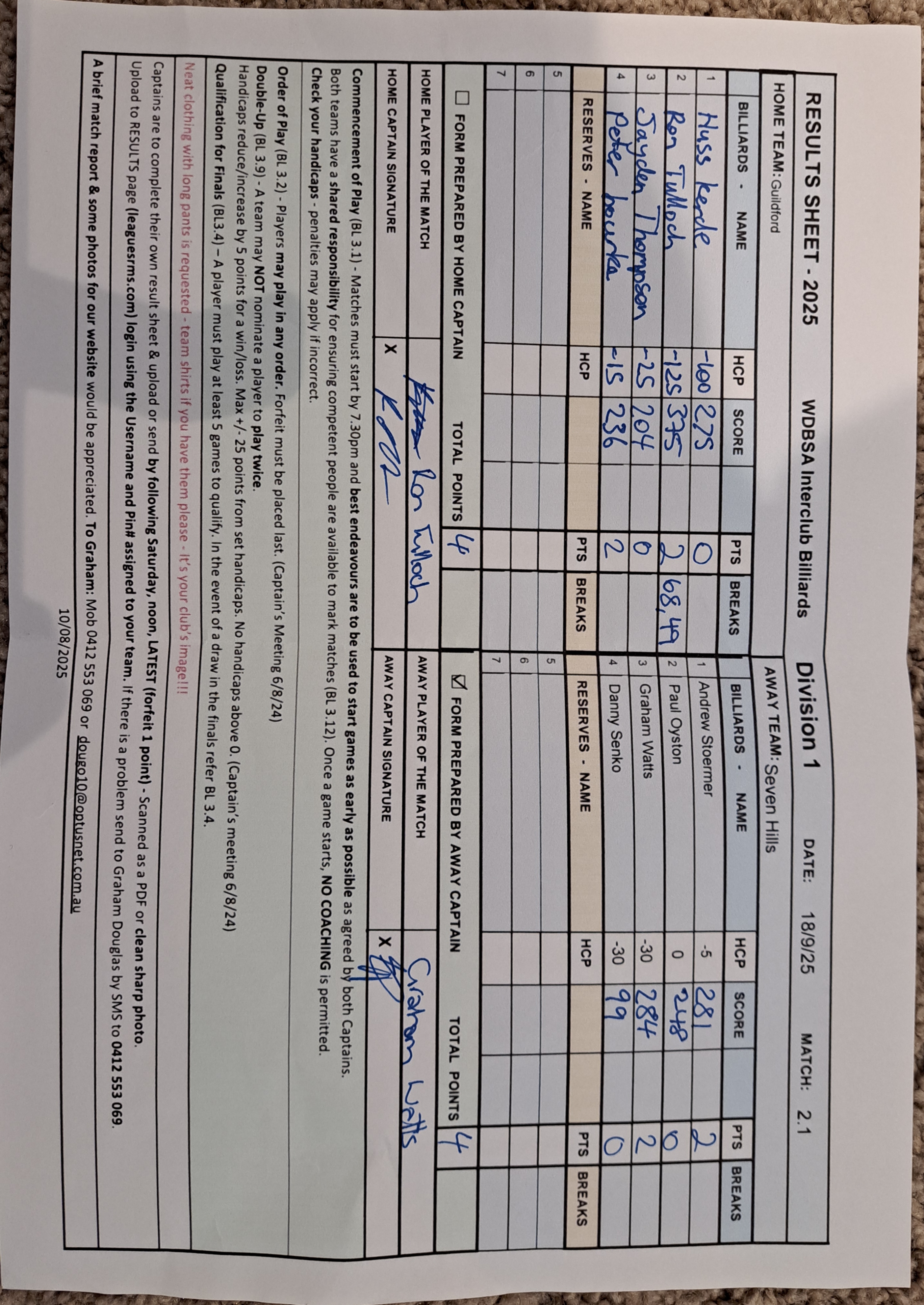 POS | Guildford | Score | Net | PTS | Break | Seven Hills | Score | Net | PTS | Breaks | Result Note | Updated on | Update by |