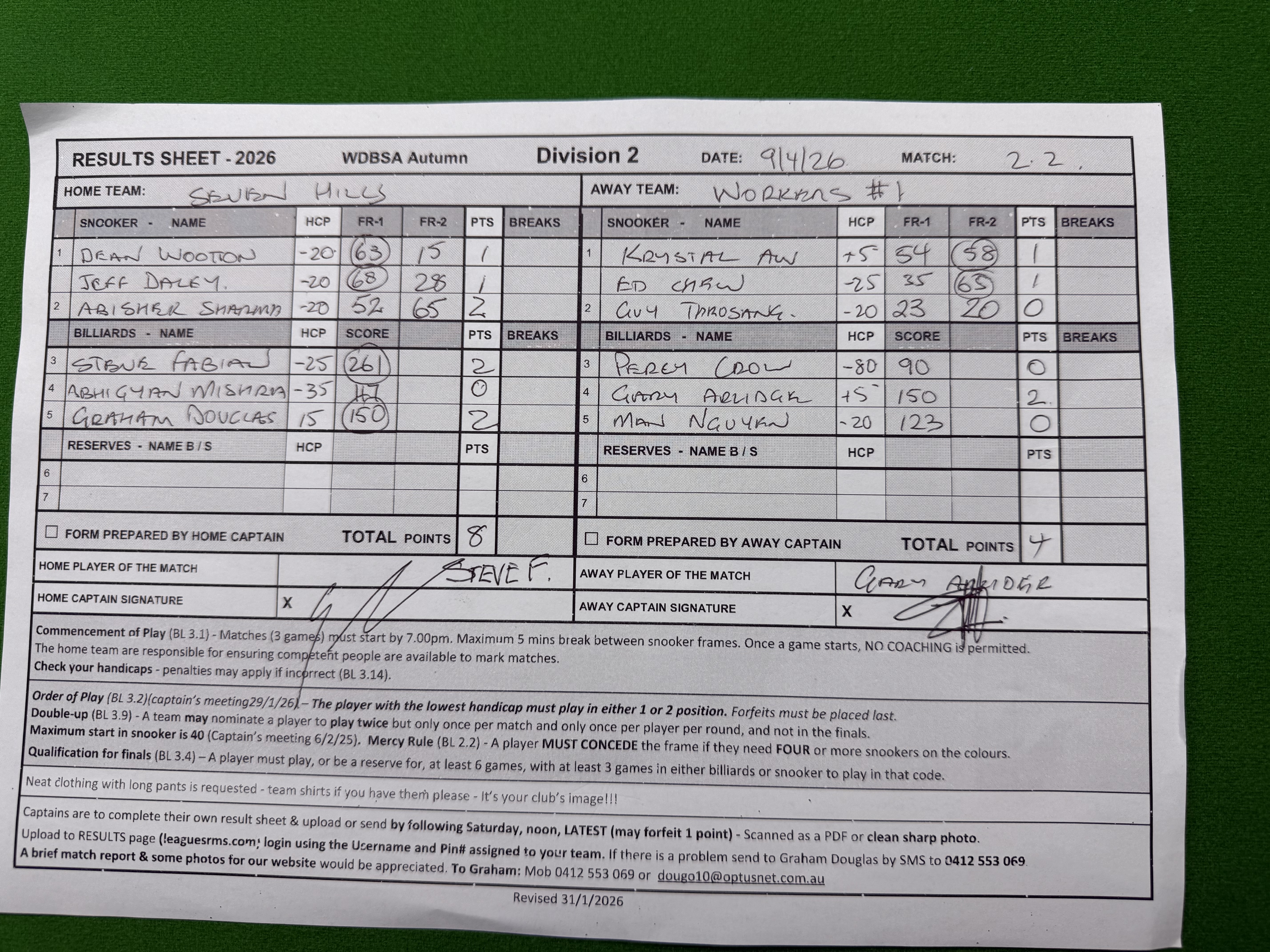 | Steve Fabian (-25) | Percy Crow (-80) | 2026-04-09 22:06:27 | Seven Hills | ||||||||||