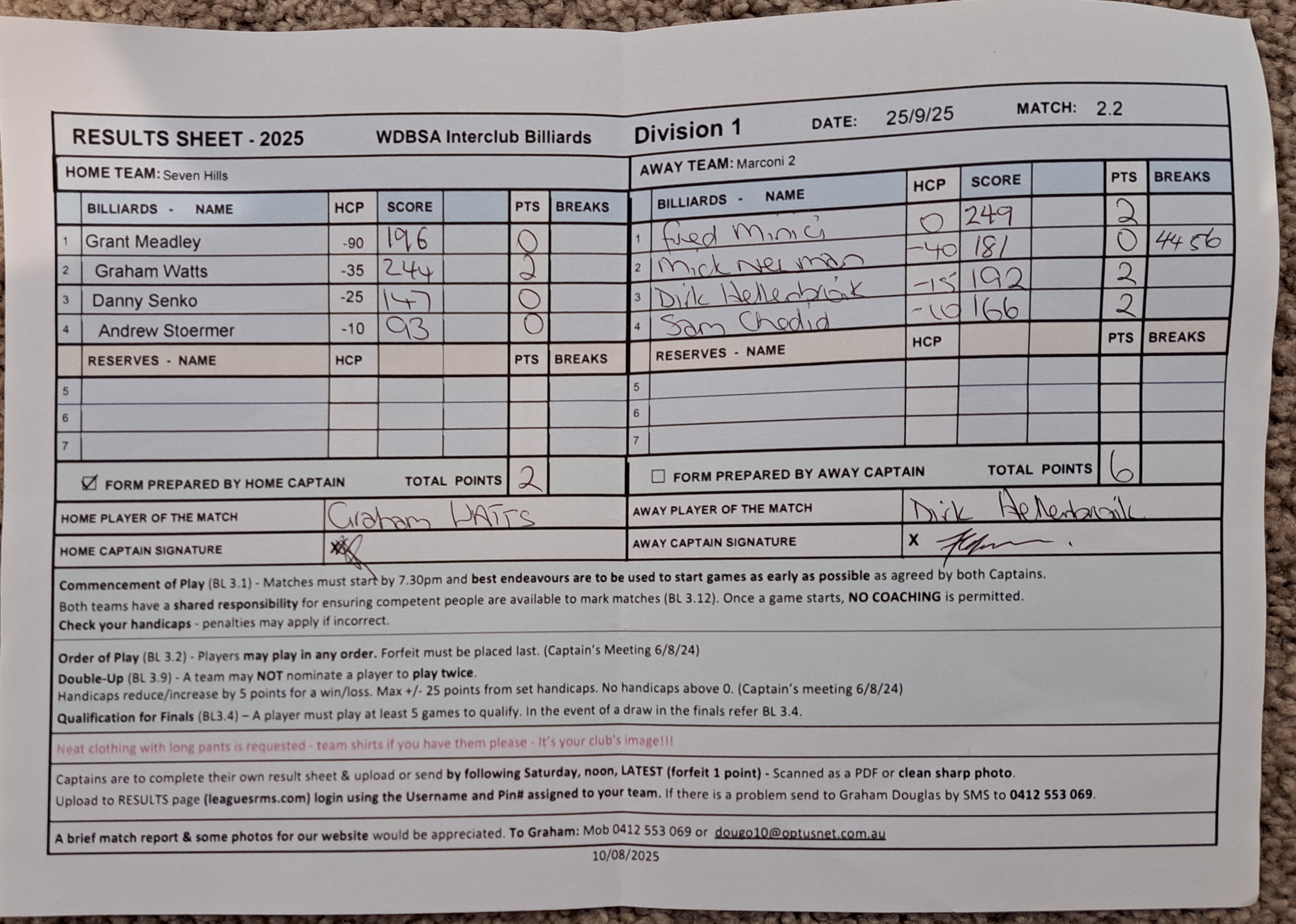POS | Seven Hills | Score | Net | PTS | Break | Marconi #2 | Score | Net | PTS | Breaks | Result Note | Updated on | Update by |