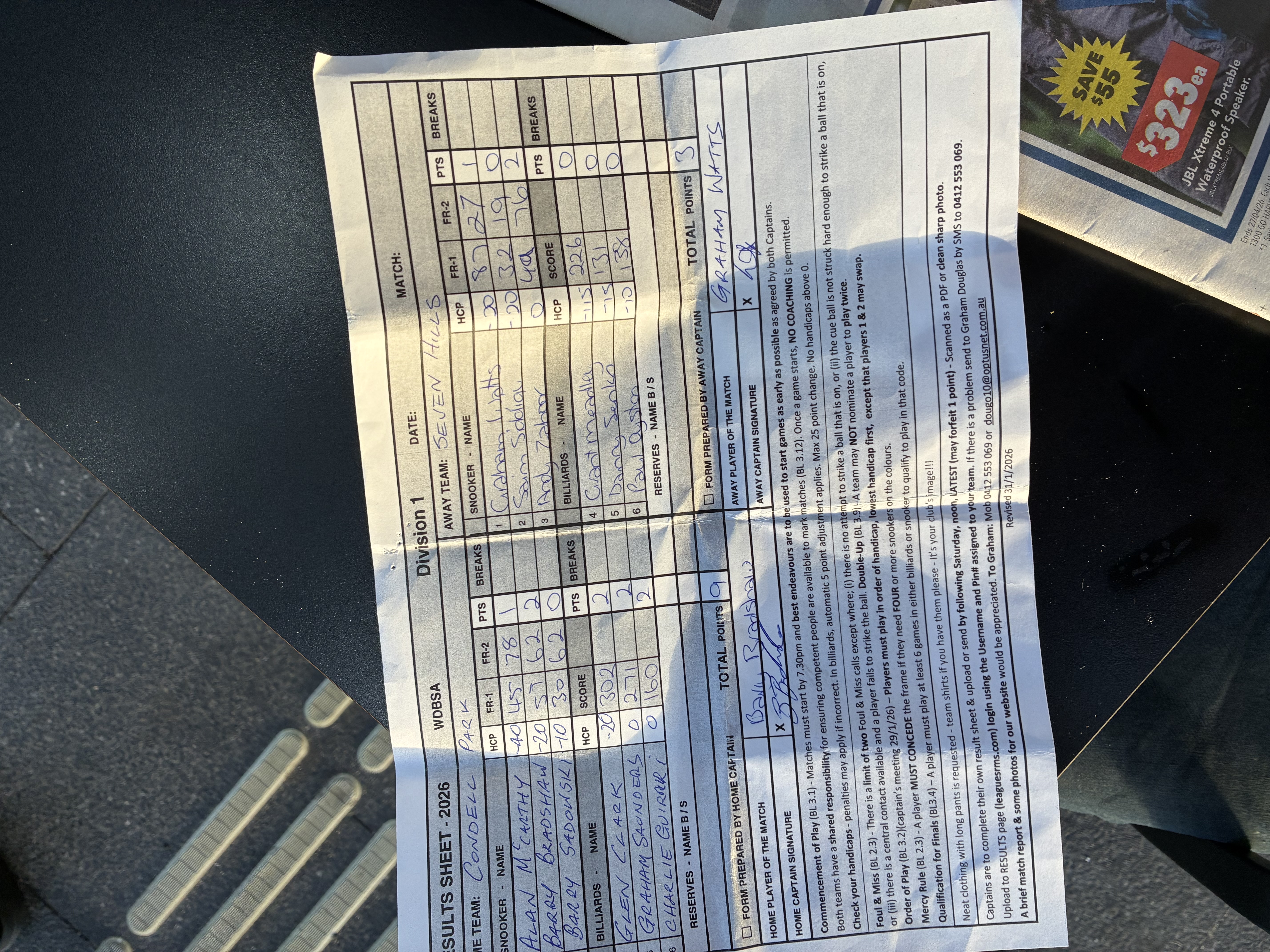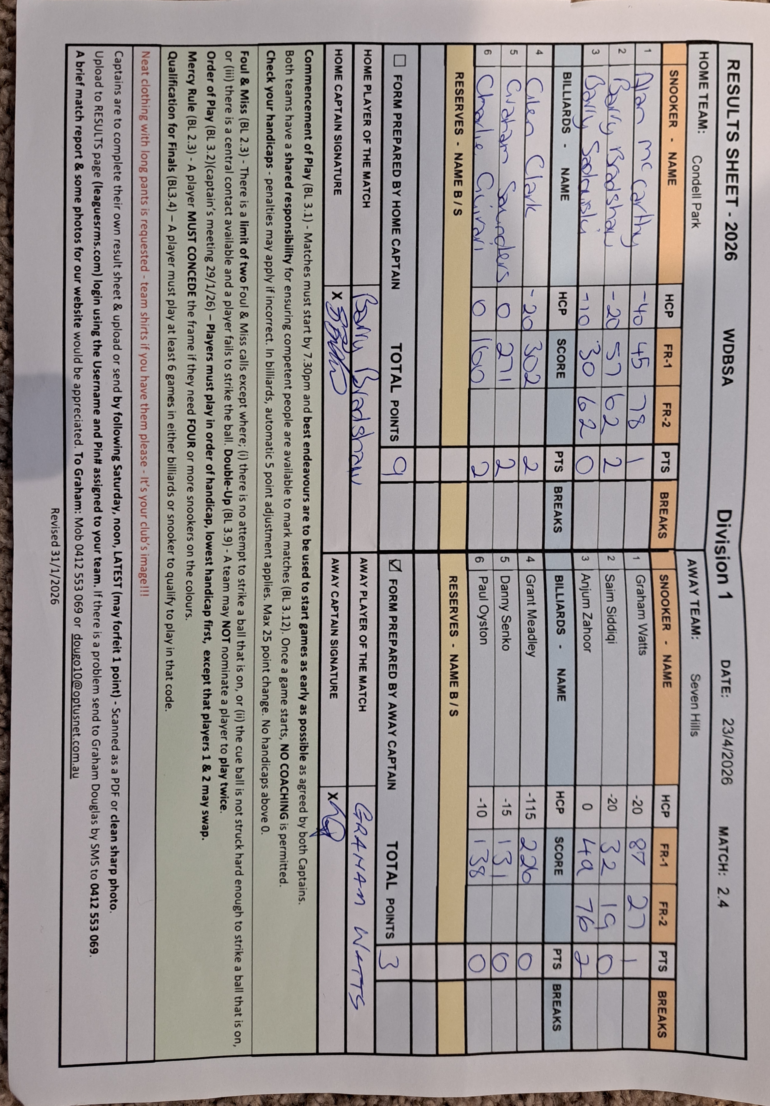 | POS | Condell Park | Frame 1 | Net | Frame 2 | Net | PTS | Breaks | Seven Hills | Frame 1 | Net | Frame 2 | Net | PTS | Breaks | Result Note | Updated on | Update by |